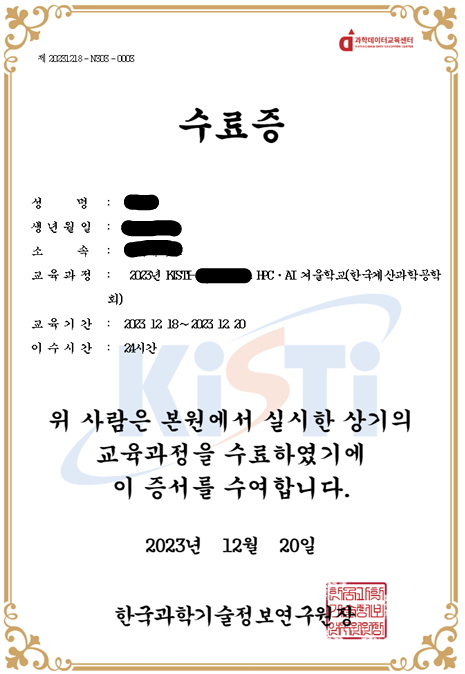 [Certificate] 한국계산과학공학회(KISTI) HPC&AI 겨울학교 본문