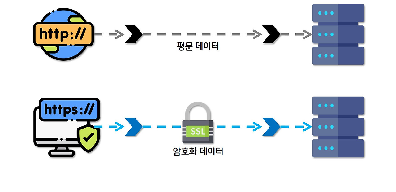 - 목적: 제3자가 내용을 볼 수 없도록 기밀성, 데이터 변조 방지 무결성, 발신자 확인 인증성 확보